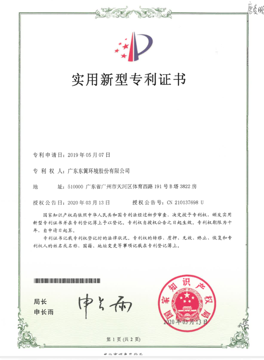 喜訊!東籬環(huán)境再獲一國家實用新型專利授權!