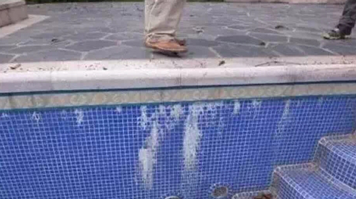 (2)游泳池壓頂施工不符合要求,產生泛堿現象。