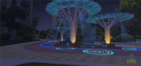景觀設計提取酒杯的形態設計成獨具特色的亭子,提供休息、靜讀的場所。在亭子上安裝地面投影照明裝置,夜晚時分在地面上投射出不同的影像,充滿趣味性和科技感。